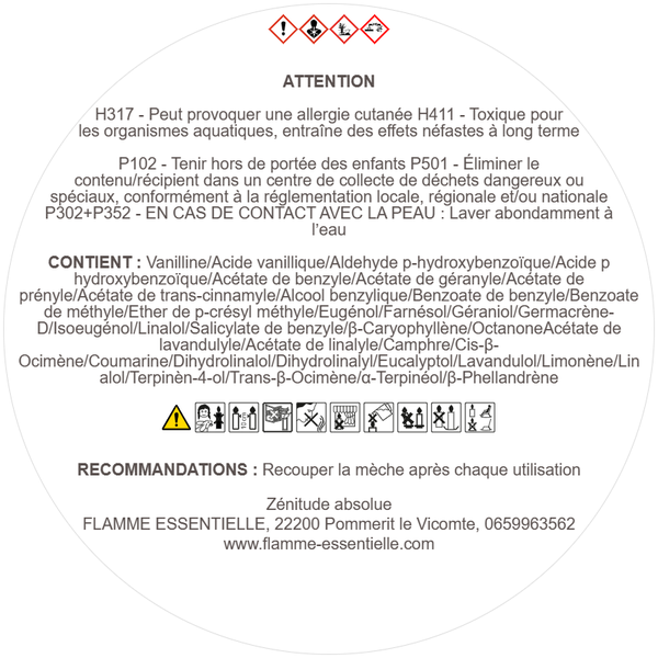 Recommandation : Ne pas laisser une bougie allumée plus de 6 heures d'affilée. Ne pas souffler sur une bougie pour l'éteindre, utiliser un étouffoir ou le couvercle. Recouper la mèche après chaque utilisation