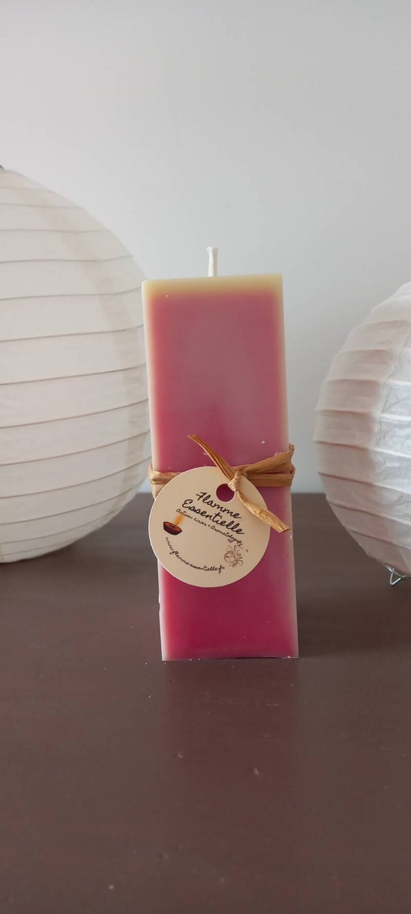 Bougie moulée carrée effet dégradé bordeau, confectionner à la cire d'Olive, mèche en coton et huile essentielle d'Orange douce Bio 100% pures et naturelles
