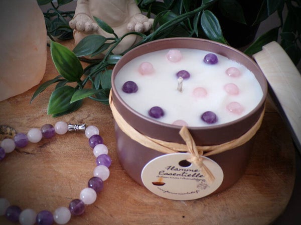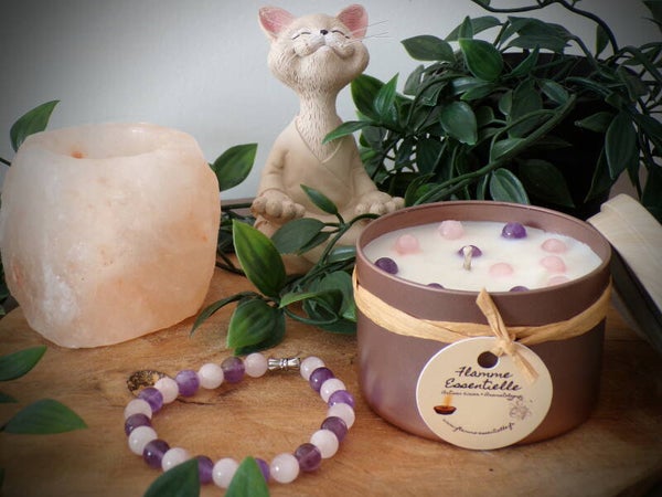 Bougie à la cire colza/coco, mèche coton/Lin, huiles essentielles de Jasmin Absolue, Lavande vraie et Ylang-ylang, perles de pierre naturelle de Quartz Rose et Améthyste pouvant être monté en bracelet.