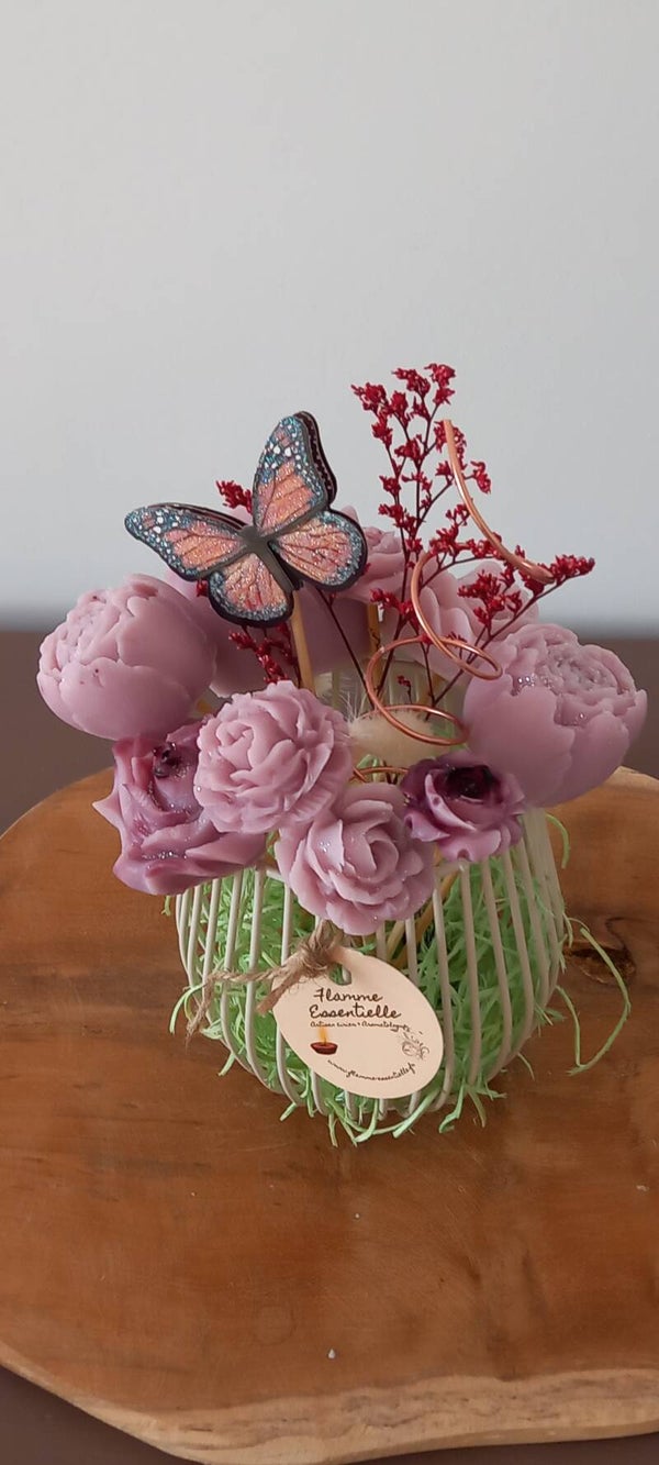 Le vase dans lequel se trouve la composition est un photophore que vous pourrez utiliser avec une bougie chauffe plat.