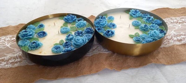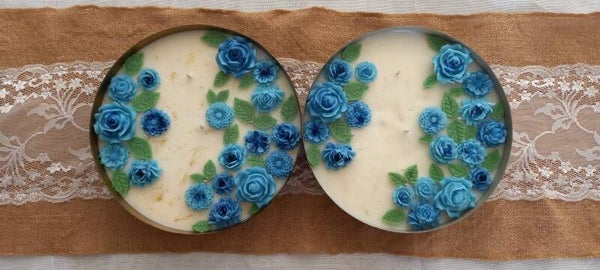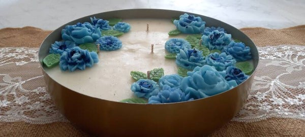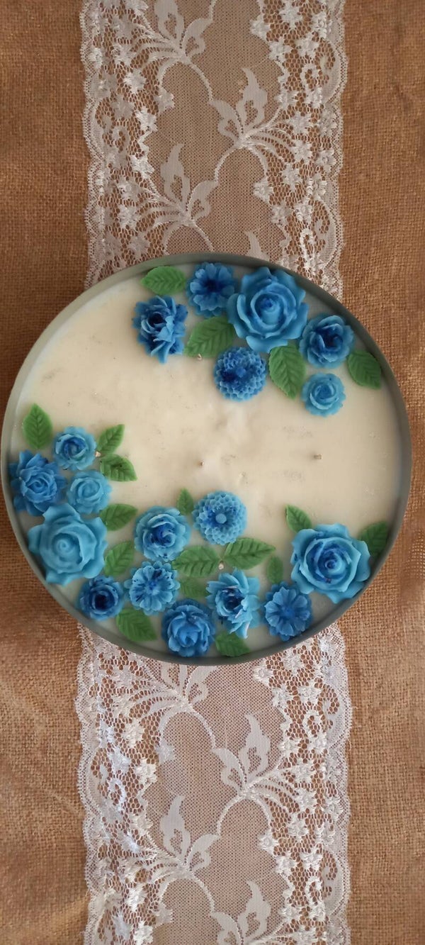 Bougie à la cire de colza/coco pour le contenant et cire d'olive pour les décorations florale, 5 mèches coton/lin et parfum de Grasse "Attrape rêve", paillettes argentée ou doré biodégradable.