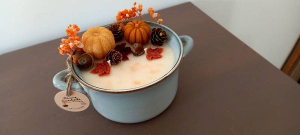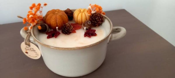 Bougie dans un bol de soupe, cire colza/coco, mèche coton/lin et parfum de Grasse "Citrouille givré". Les fondants sont en cire d'olive et parfum de grasse "Citrouille givré".