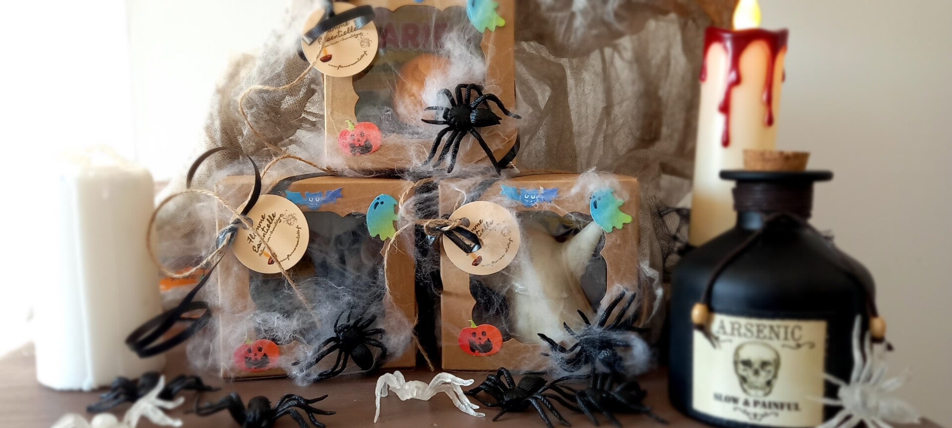 Coffret Halloween comprenant une bougie en cire d'olive, parfum de Grasse "Citrouille givré" ,mèche coton, 2 sachets de bonbons et 2 yeux au chocolat.