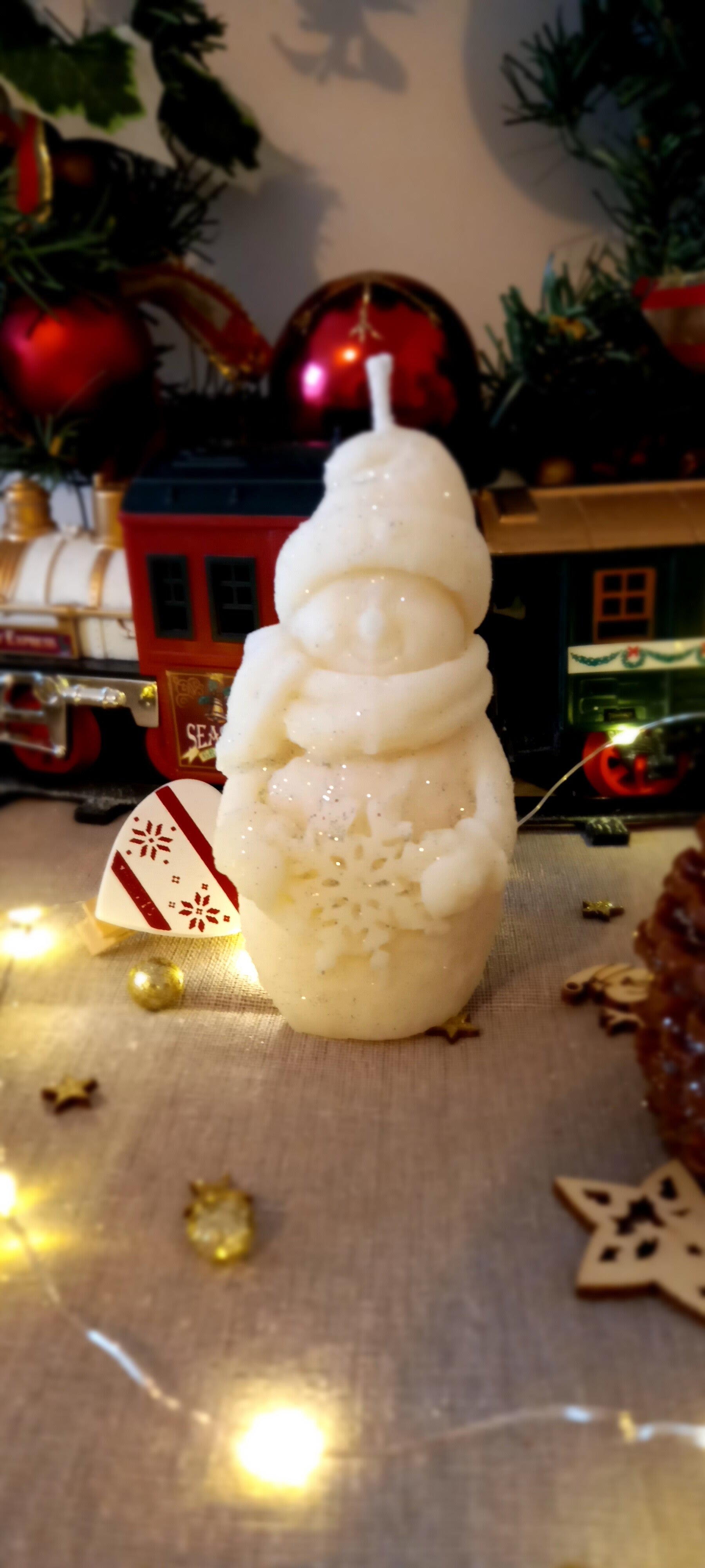 Bougie décorative en forme de Bonhomme de neige, cire olive, mèche coton et parfum de Grasse "Epice de Noël".