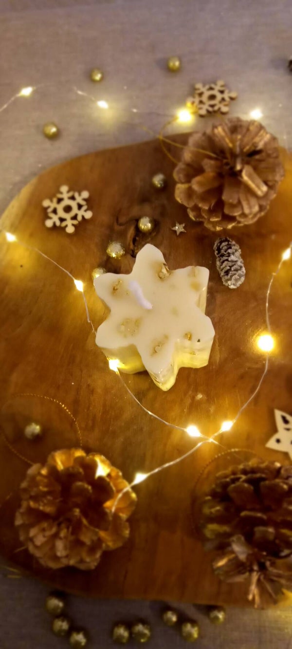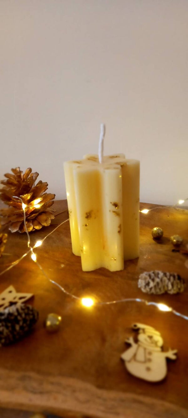 Bougie en forme d'étoile à la cire olive, mèche coton et huile essentielle de Cannelle et Mandarine.