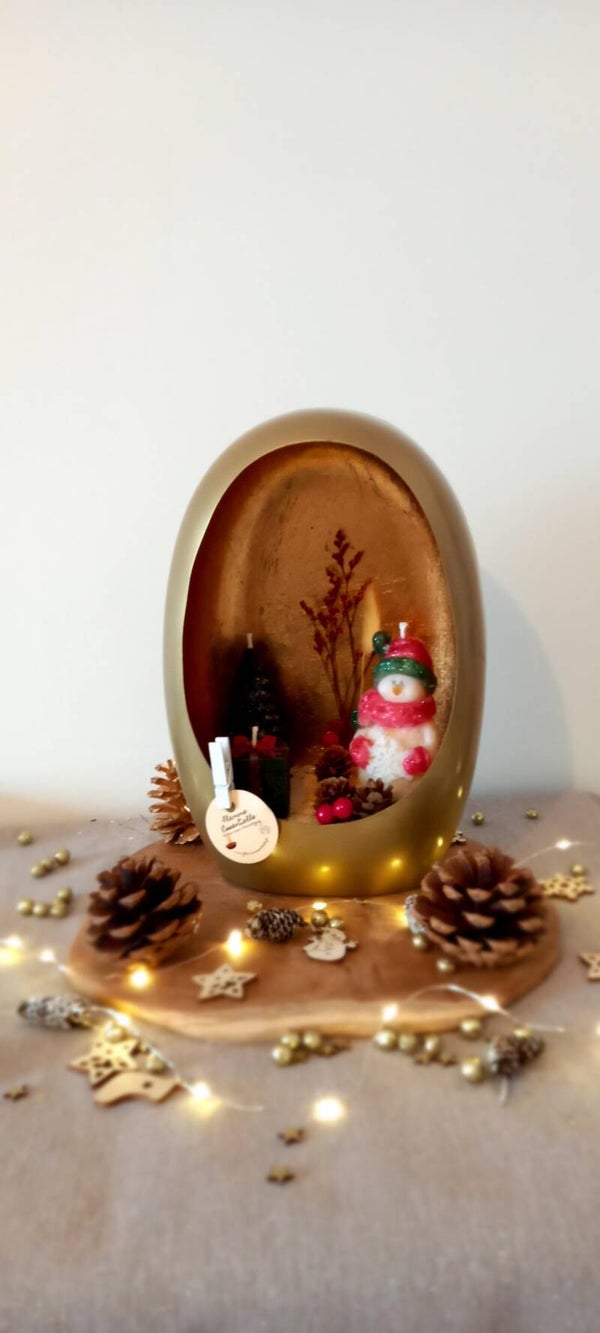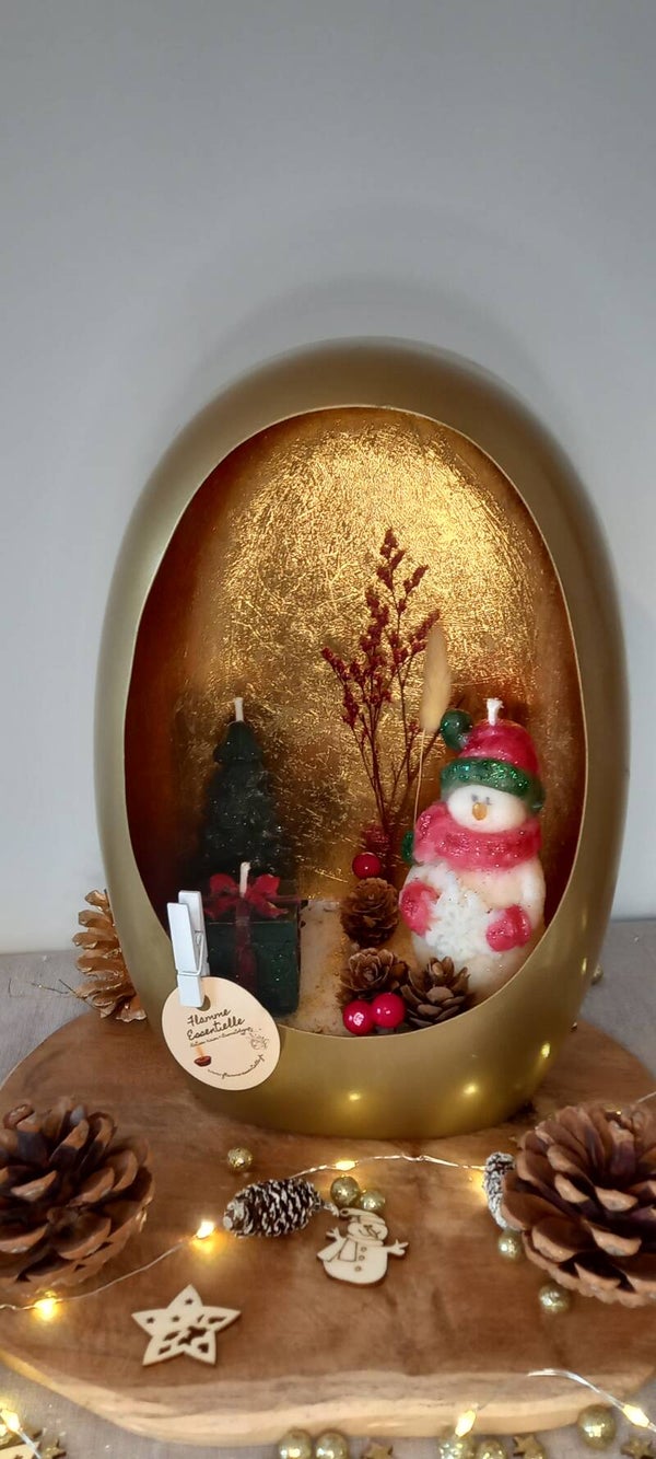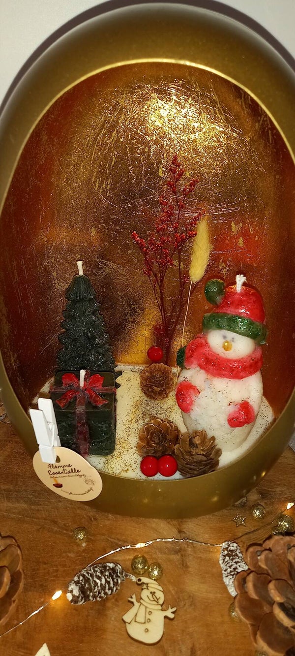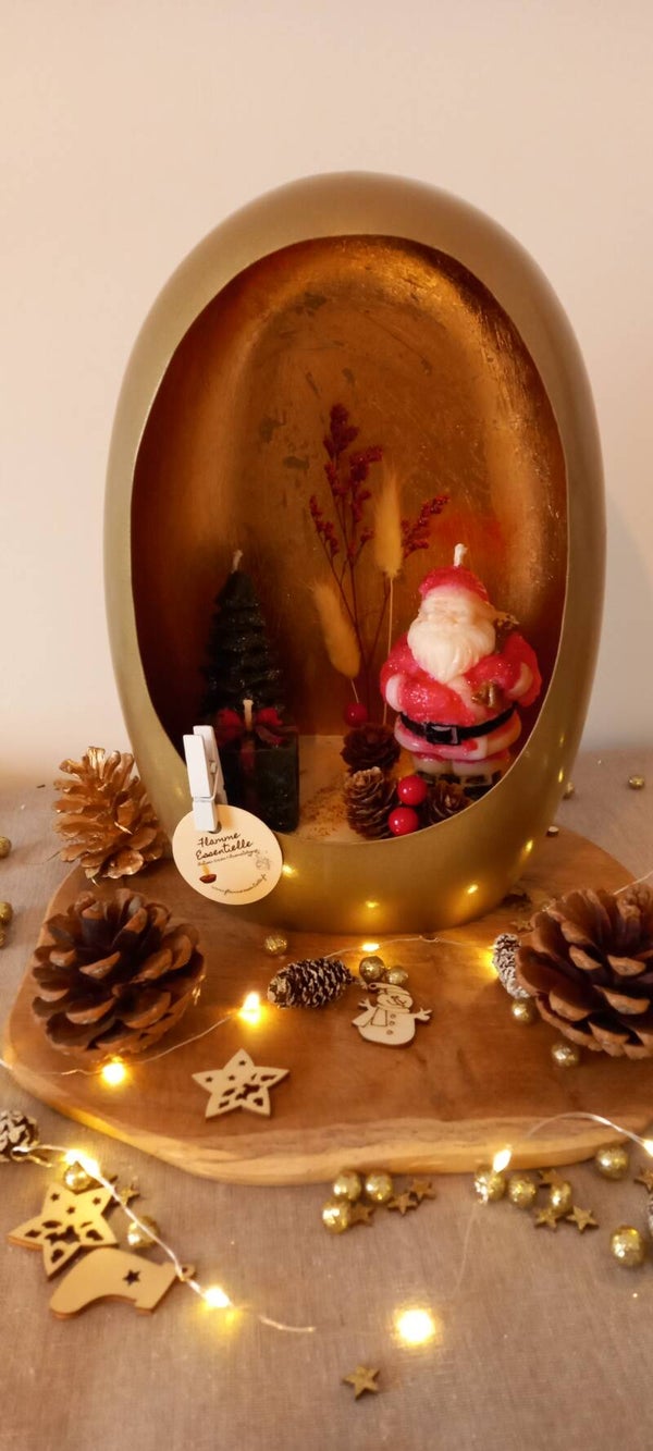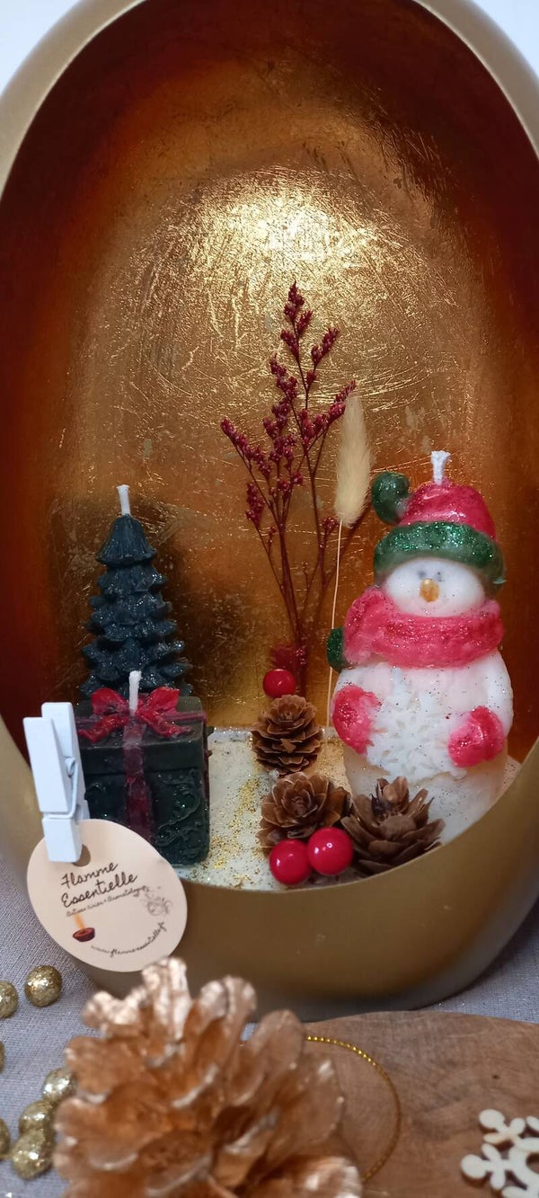Scène de Noël dans un bougeoir rempli de cire de colza/coco, mèche coton lin et Parfum de Grasse "Epices de Noël" et 3 Bougies décoratives en cire d'olive, mèche coton et petites décorations non combustible