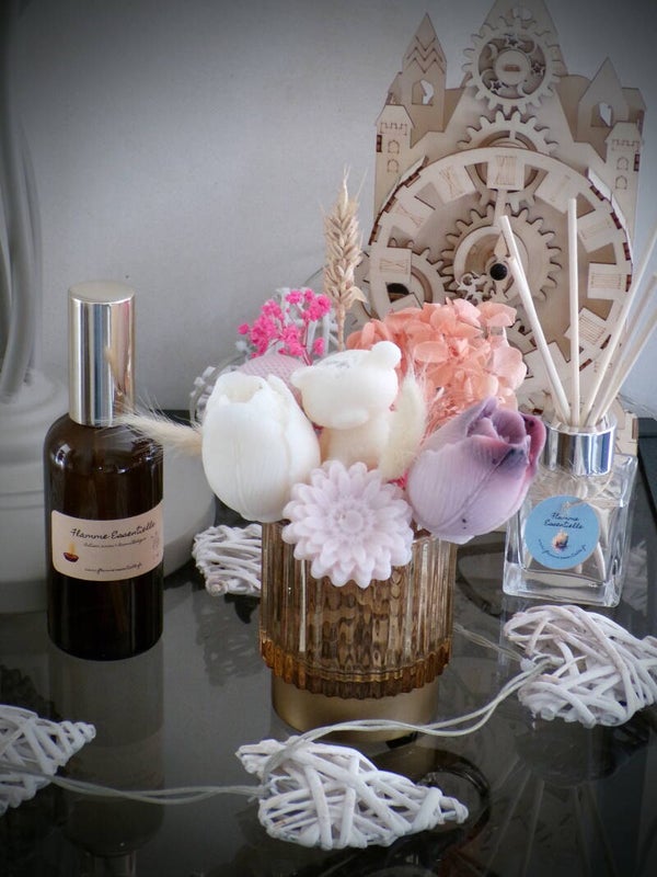 Abricot-romarin/ Azalée du Japon/ Caramel beurre salé/ Douce étreinte/ Douceur d'Automne / Éclipse de Lune/ Fleur de Coton/ Fleur de Tiaré/ Fraise des Bois/ Macaron vanille/ Menthe-basilic / Mûre-Myrtille/ Rose Ancienne/ Vieux Rhum.