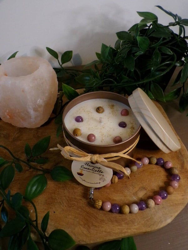 Bougie à la cire colza/coco, mèche coton/Lin, huiles essentielles de Hélichryse italienne, Lavande vraie, Orange douce et Ylang-ylang, perles de pierre naturelle de Améthyste, Jaspe paysage et Rhodonite pouvant être monté en bracelet.