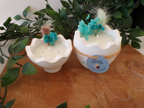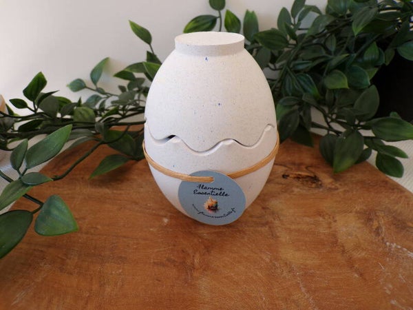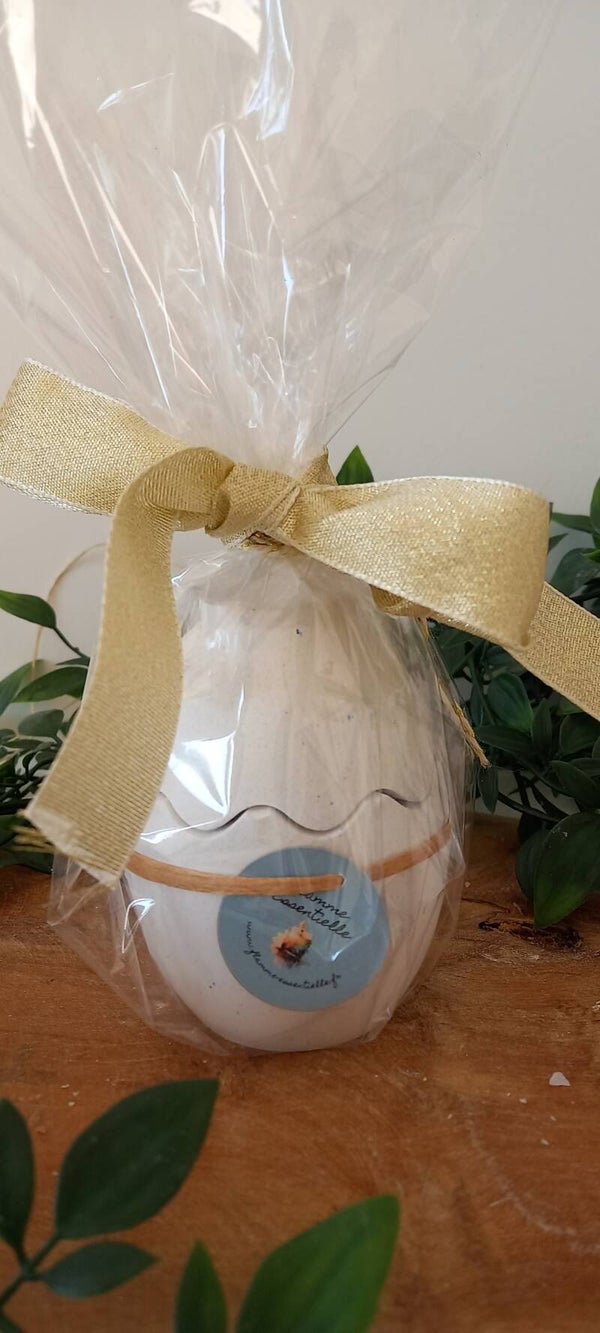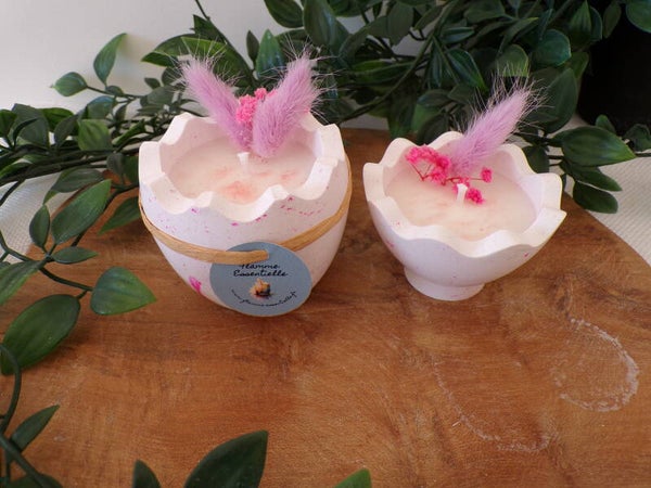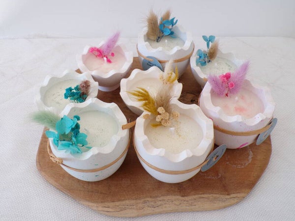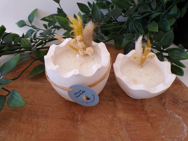 Oeuf en Raysin fait à la main garni de cire de colza/coco dans les 2 récipients avec mèche en coton et parfum de Grasse " Chocolat/noisette" et décorations en fleurs séchées.
