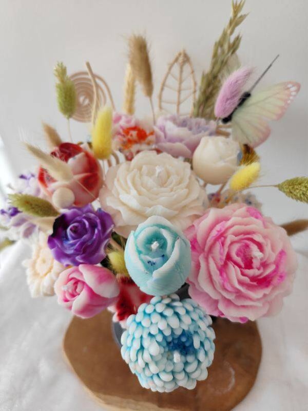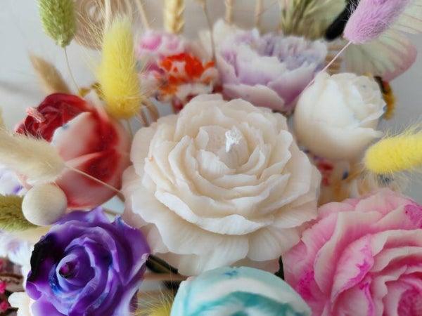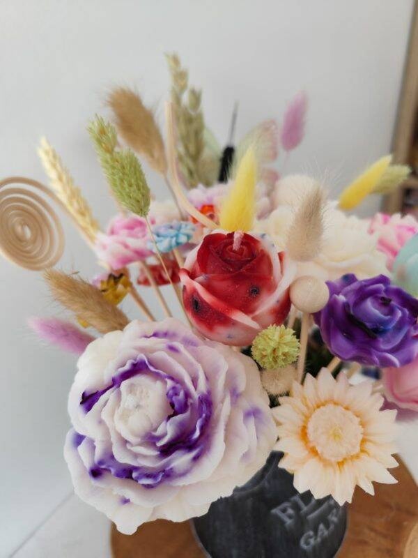 Bouquet de 24 Fondants et bougies en fleurs senteur Bien être ( huile essentielle de Jasmin absolue, Lavande vraie et Ylang-ylang ), mélange de fleurs séchées et décoration en bois dans un pot en zinc en forme d'arrosoir.