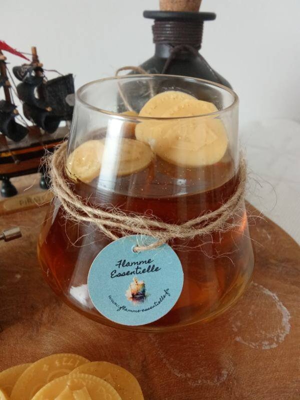Bougie dans un verre, mèche coton/lin, cire cristal et parfum de Grasse " Vieux Rhum".