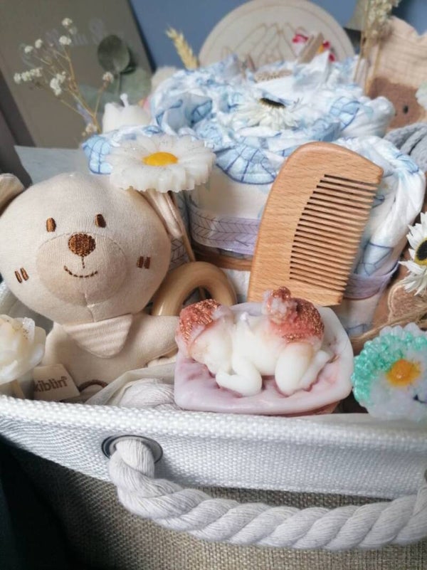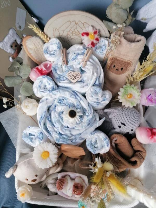 Panier naissance composé de couche bio taille 2, un peigne et une brosse en bois, un hochet, 2 bavoirs, un doudou en crochet fait main, une plaque bracelet de naissance, bougies et fondants à la cire d'olive, mèche coton, parfum de Grasse " Douce couverture" et fleurs séchées.